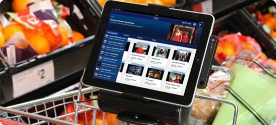 - Сеть супермаркетов в Соединенном Королевстве Sainsbury’s в партнерстве с телевизионной компанией Sky позволяет покупателям смотреть ключевые спортивные мероприятия во время похода по магазинам с помощью встроенного в тележку iPad и динамиков. Тележка Sky Go оснащена поворотным держателем для iPad, динамиками и встроенным аккумулятором с самозаряжающейся панелью из солнечных элементов. Любящие спорт покупатели всего лишь должны скачать приложение поточной передачи Sky Go на свой планшет и затем загрузить его в установочный модуль тележки.